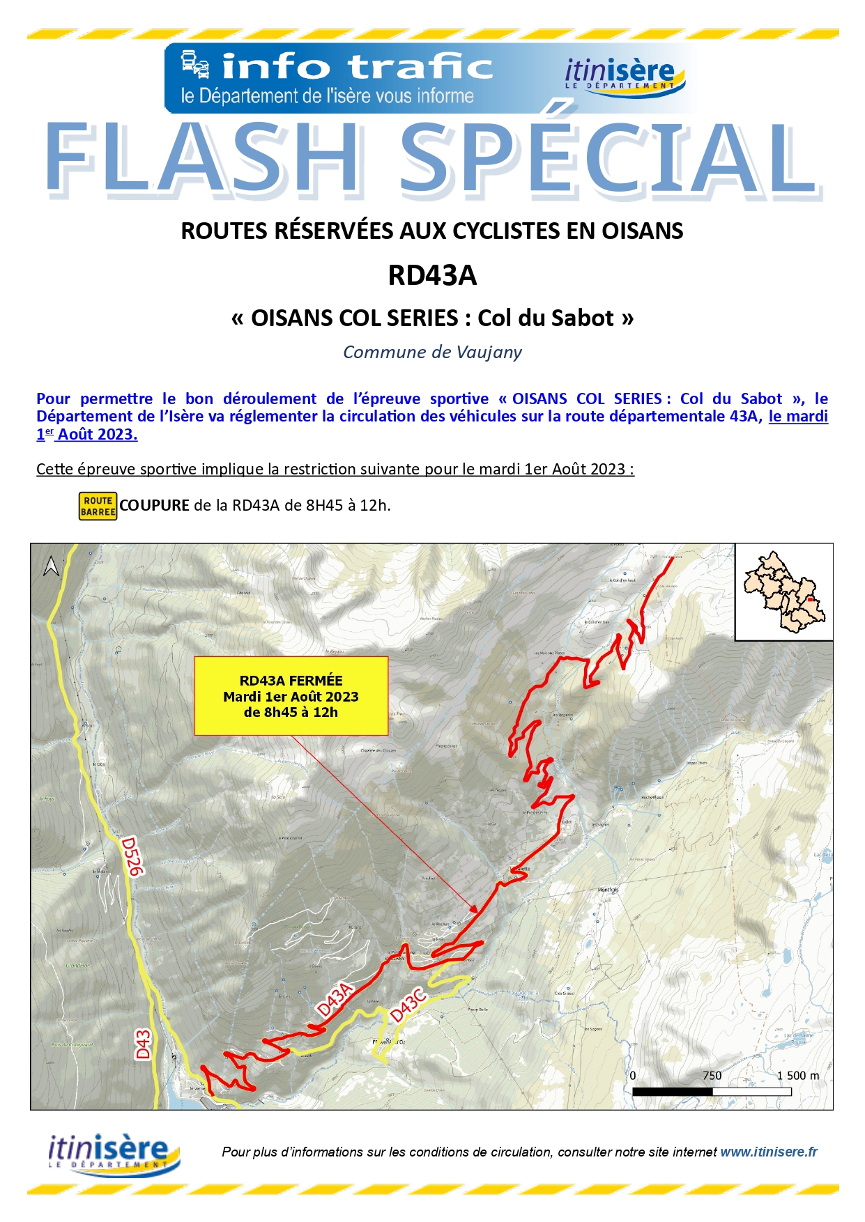 OISANS COL SERIES : Col du Sabot – Vaujany – Mardi 1er août 2023 : COUPURE de la RD43A de 8h45 à 12h00.